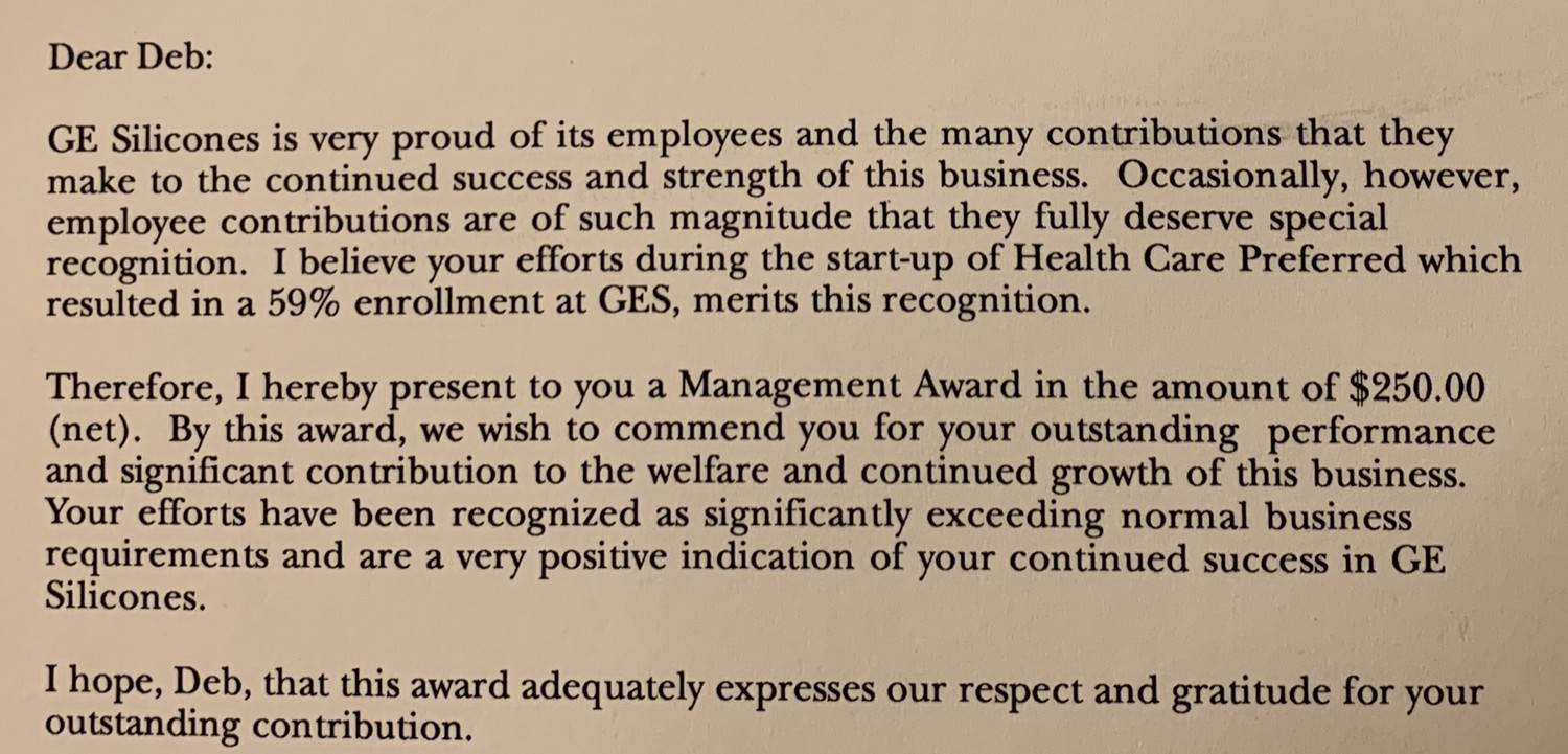 It was Bill who gave me a $250 Management Award 27 years ago (a little over $446 in 2020 dollars). Equally (if not more) important to me as his employee was the letter that accompanied the check. I still have it, and continue to treasure it: