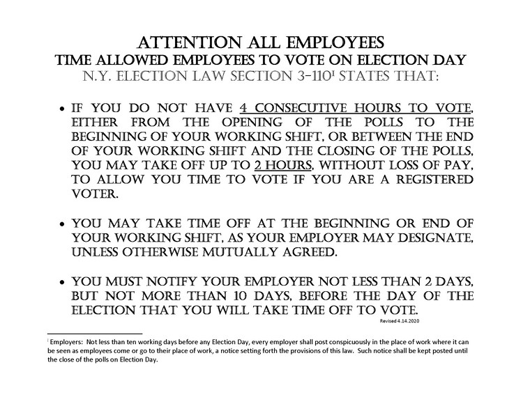 NYS Election Law requires that NYS employers post the NYS Election Leave Notice Below at least 10 days before Election Day (For 2022, Tuesday, November 8th) in 12-hour employee areas. Employers must provide up to 2 hours of paid Election Leave to employees who do not have 4 consecutive hours to vote on Election Day: